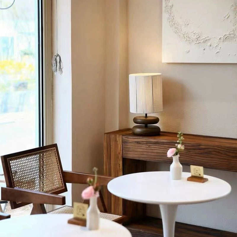 De Zenbo tafellamp is een ode aan natuur en balans, geïnspireerd door de eenvoud van de Japandi-stijl. De massief houten voet, gevormd als gestapelde keien, straalt rust en stabiliteit uit. De textiele lampenkap in een warme burlywood-tint verspreidt een zacht, diffuus licht, waardoor een kalmerende sfeer ontstaat in elke ruimte.